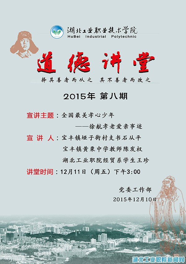 学院2015年第八期“道德讲堂”将于12月11日举行,现将有关事项通知如下: