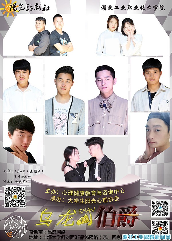 为进一步丰富我院校园文化生活,倡导当代大学生树立正确的人生观、爱情观,大学生阳光心理协会经过前期精心排练、汇演、试演,现将举办年度毕业专场大型话剧公演,欢迎广大师生届时前来观看。