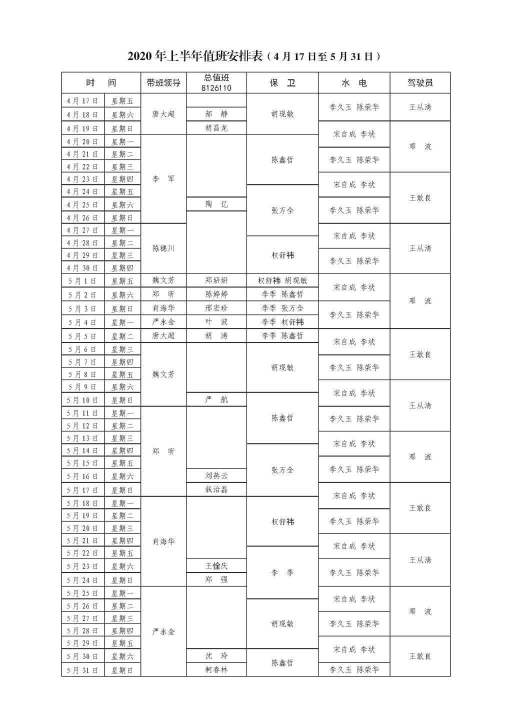 2020年上半年值班安排表(4月17日至5月31日)