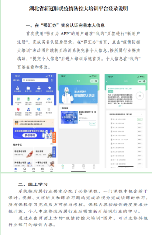 各级疫情防控机构和专兼职人员需下载“鄂汇办APP”,完成“新用户注册”,实名认证后登录。在“鄂汇办”OD在线(中国),点击“疫情防控大培训”滚动图片跳转至培训系统完善个人信息,根据自己所属行业据实填写,系统按照不同行业需求自动分配必修课程,一门课程中包含若干课时,视频、文字讲义和课后习题均完成后视为完成该课时学习,所有课程学习完成后方可参与考核。经线上考核合格的参训人员可获得培训合格证明。