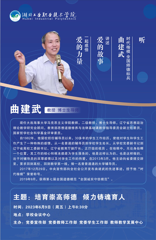 为贯彻落实立德树人根本任务,进一步加强学校师德师风建设,提升教师思想政治素质和职业道德水平,引导教师提高政治站位、坚定职业信仰,牢固树立“以德立身、以德立学、以德施教、以德育德”教育理念,争做“四有”好老师,学校邀请大连海事大学曲建武教授来校举办“培育高尚师德倾力铸魂育人”主题讲座。现就有关要求通知如下: