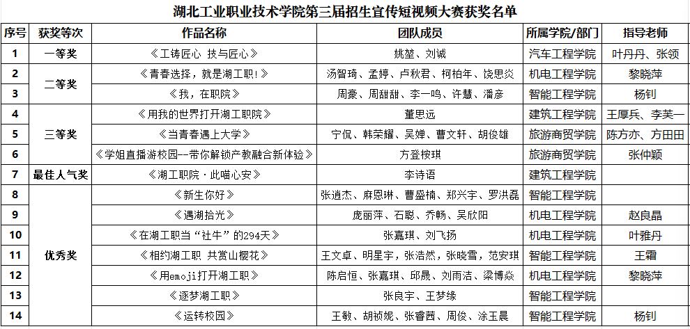 根据我校《关于举办第三届“百草园”大学生网络文化节暨招生宣传短视频大赛的通知》工作安排,截至2025年7月10日,共收到短视频作品68件。经初审、复审及专家终审,评出获奖作品14件,现予以公示(名单附后)。